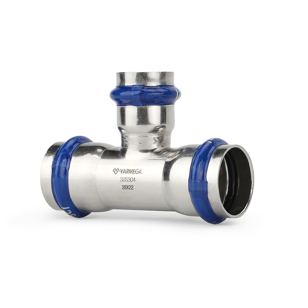 Тройник раструбный Varmega Inox Press переходной, используется для соединения труб разных диаметров.